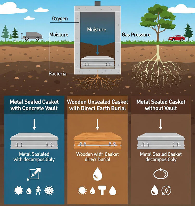 The casket material dramatically affects how quickly decomposition proceeds after burial. Metal caskets, particularly those made from steel or bronze, create different preservation conditions compared to wooden caskets.